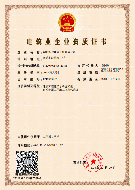 繼11月27日晉升“建筑工程施工總承包貳級資質”后,12月29日,九度城服集團自來水公司所屬的湖北暢泉建設工程有限公司再傳喜訊,又獲“市政公用工程施工總承包貳級資質”,榮升“雙貳級”,為2024年元旦獻上了一份厚禮。